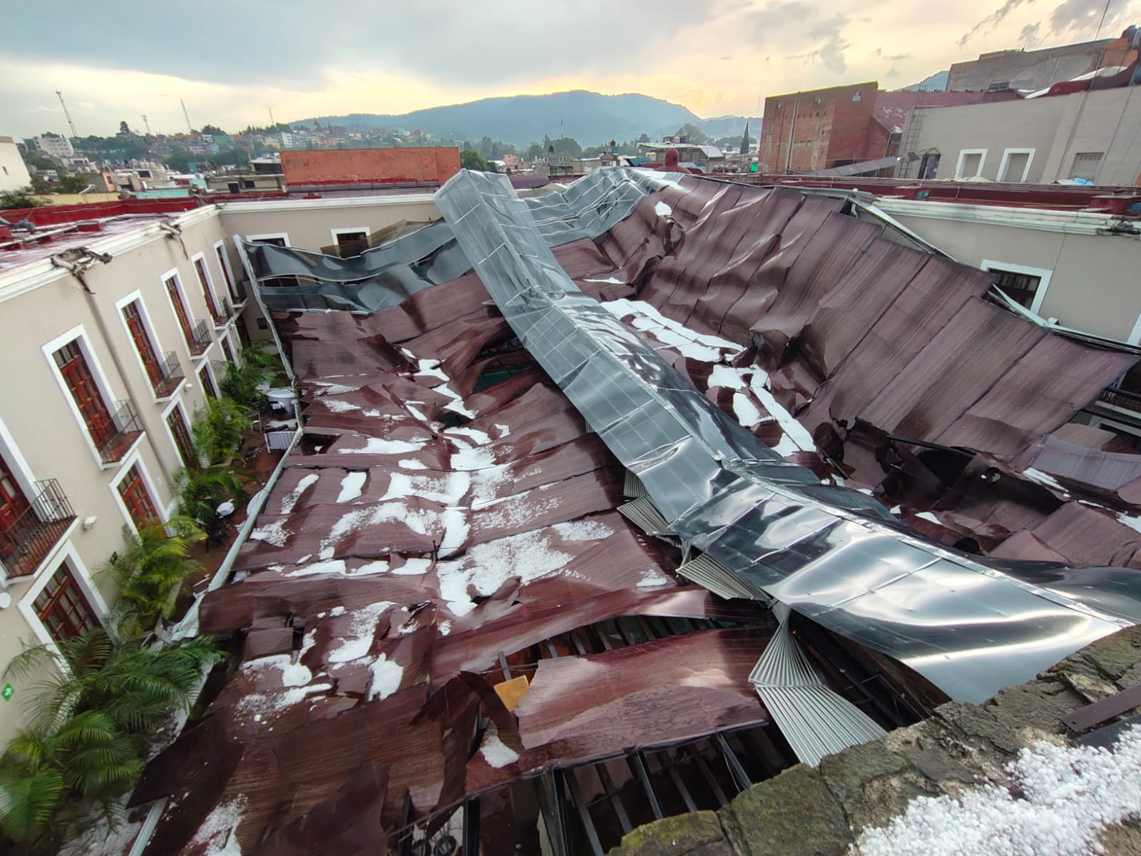 El techo blanco del patio principal del Hotel Posada San Francisco, localizado en el zócalo de Tlaxcala, cayó ante una fuerte granizada y vientos huracanados durante la tarde de este domingo, por lo que la empresa suspendió operaciones y las estructura son analizadas por personal de Protección Civil del mini estado.